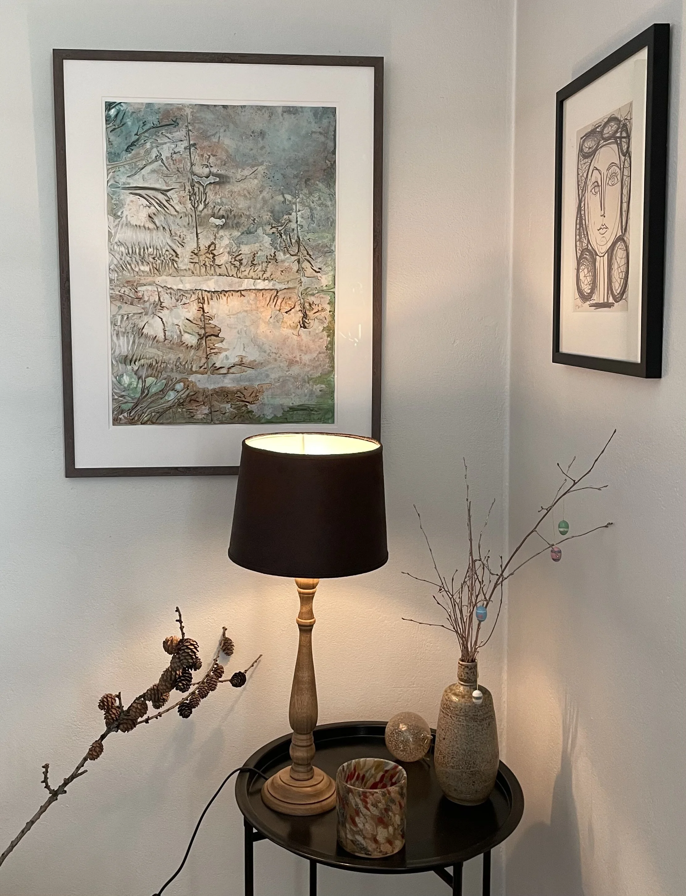 Monotypi med tittelen “Fabel” er plassert i eierens stue. Bildet er solgt til en kunstsamler i Oslo i 2020.